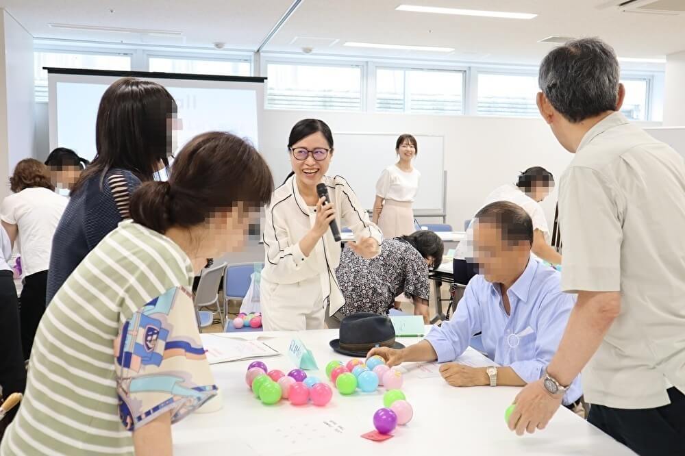 幅広い年代の16名が参加する講座はとてもアットホームな雰囲気。ボールを使ってランダムに受講者が話すお題が決まるなど、マリサさんのアイディアとユーモアに溢れた実践的な講座になりました。