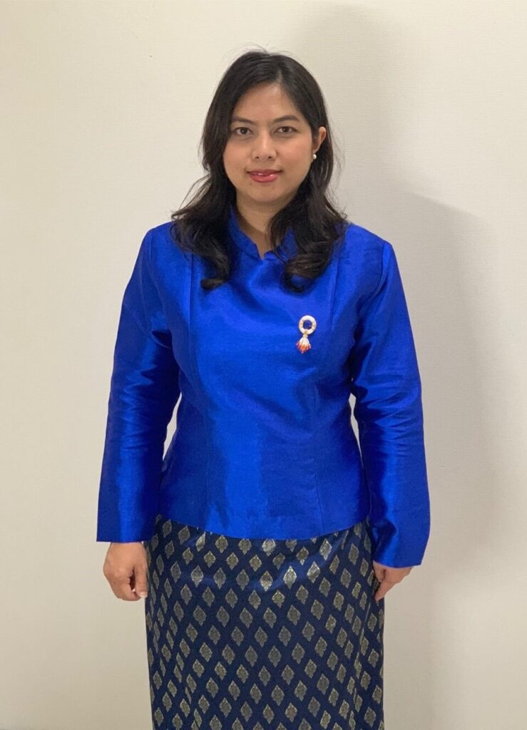 「交流会やパーティーなどに民族衣装を着ていくと、相手との距離が縮まり、文化交流にとても役立つ体験を重ねてきました。高校生の時に、イギリスやニュージーランドへ行った時も、民族衣装を着てタイ文化を紹介しました。今日の服は元来、政府や王宮の行事で着る衣装です。結婚式では、金色、黄色、ピンク色で光沢のある衣装を着ます。」