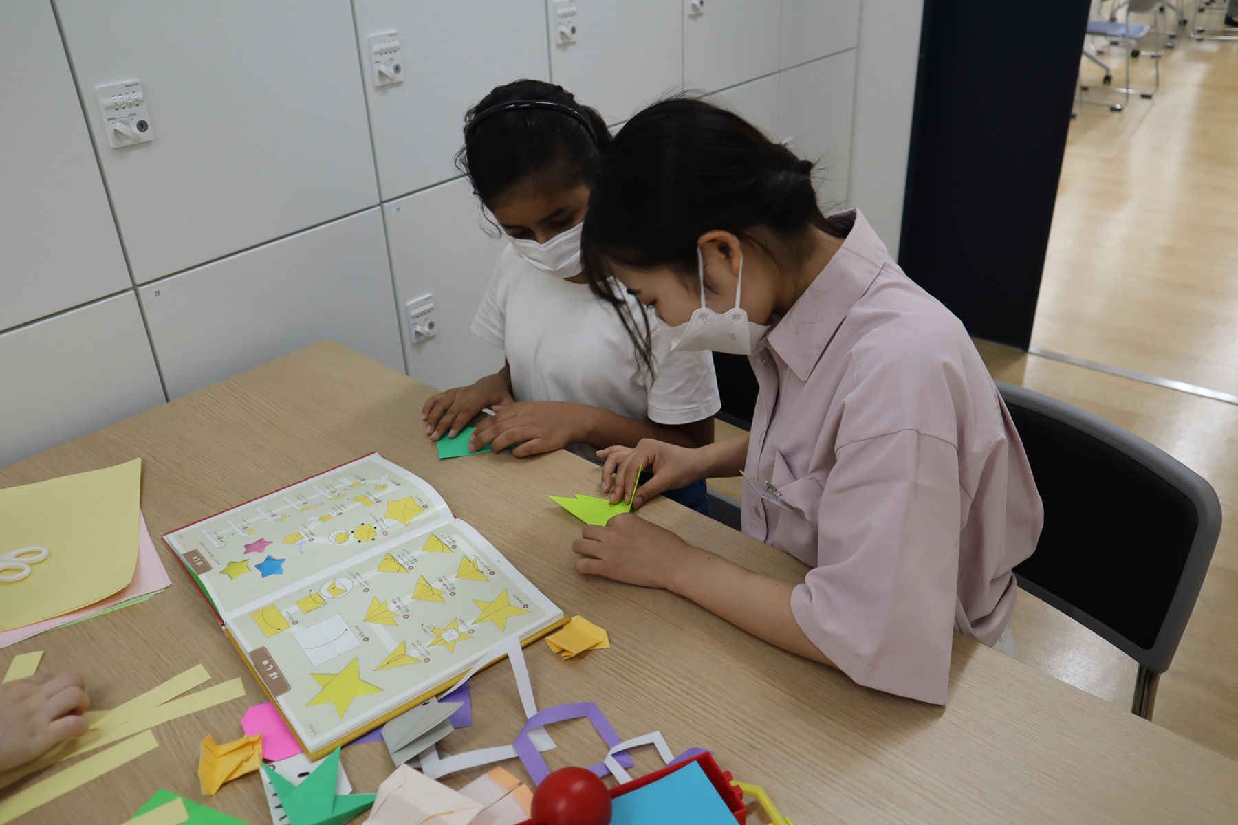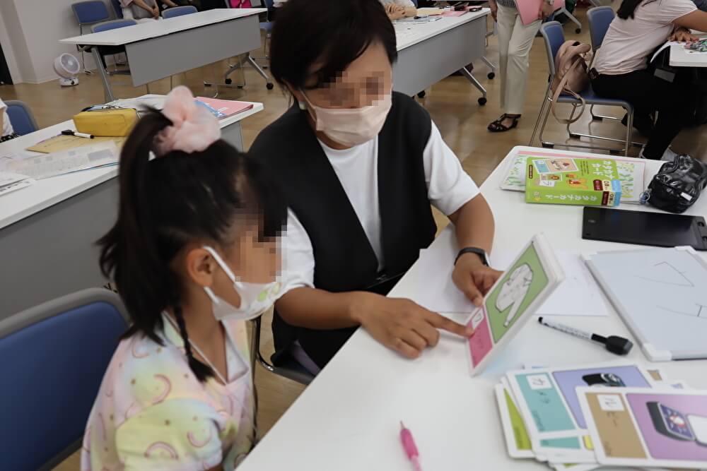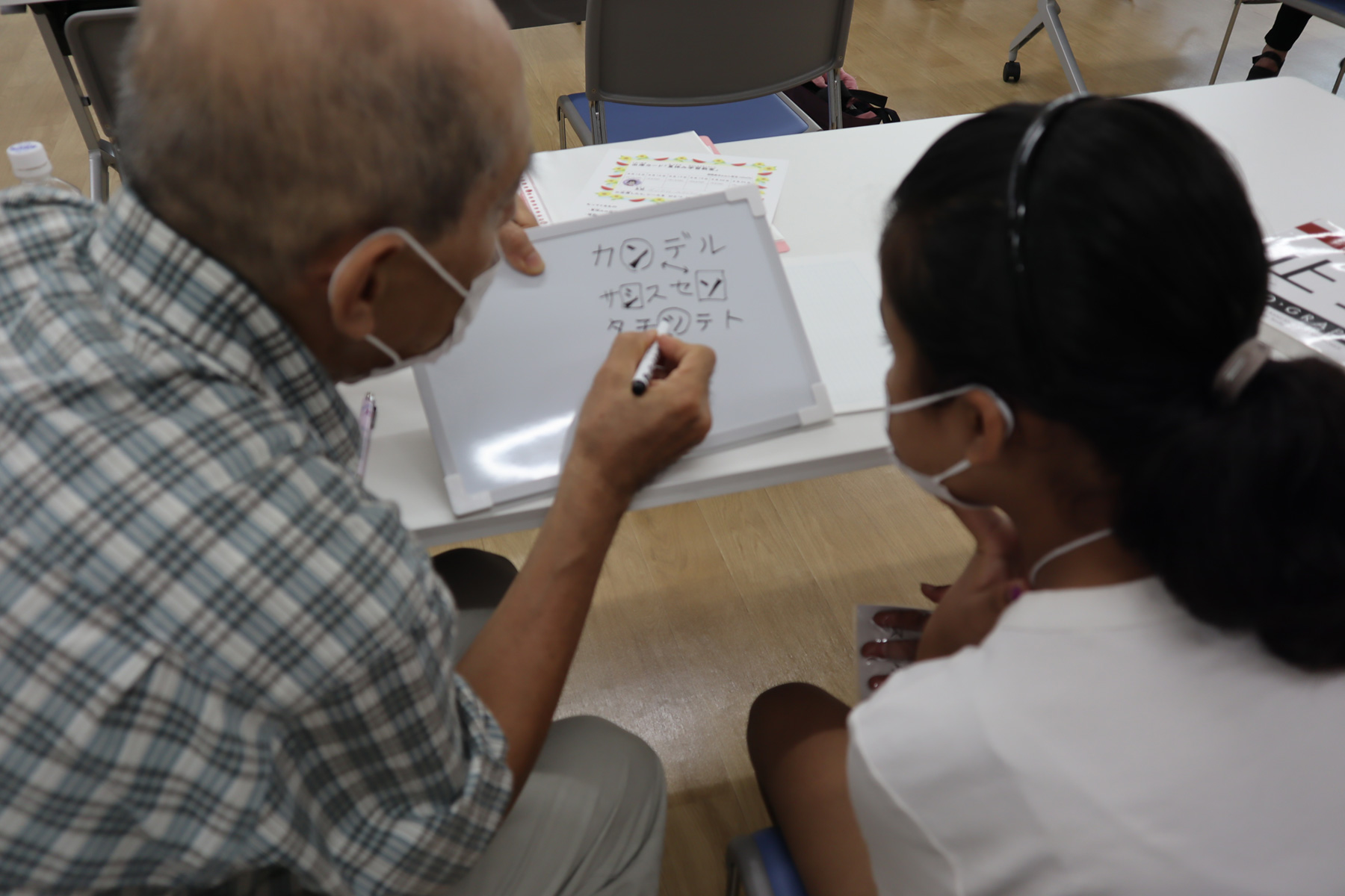 子どもが持参した「夏休みの宿題」に、支援者と一緒に取り組みました。日本語学習を始めたばかりの子どもには、あいうえお表やパズルを使いながら日本語学習を行いました。また、休み時間には、折り紙やけん玉、コマなどで遊びました。