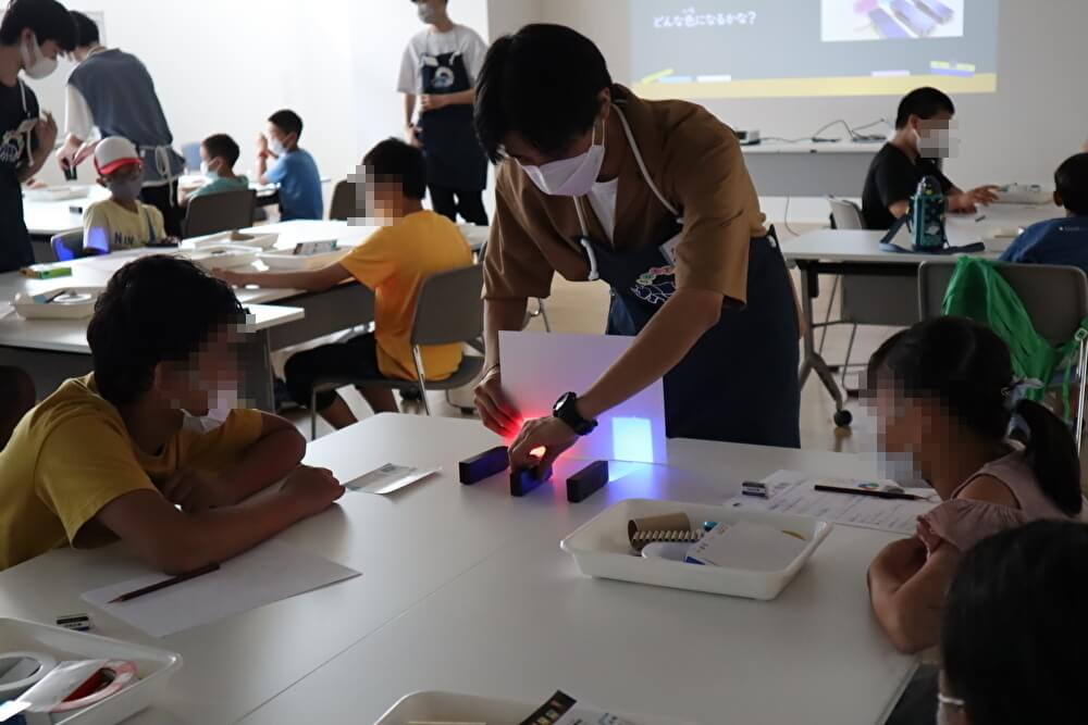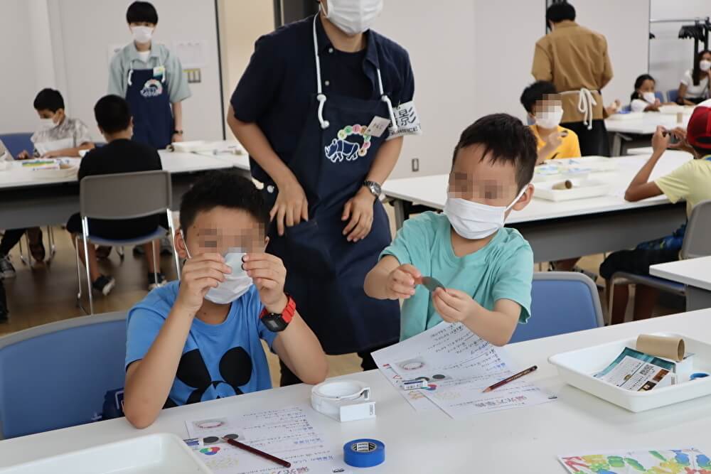 | 内容 | 大学生のお兄さんから光の不思議な性質を教えてもらい、その後、特別なシートとテープを使って、きれいな模様が見える「偏光万華鏡」を作りました。 |